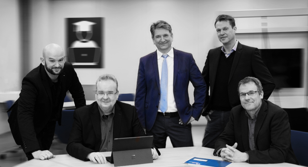 Von Link nach rechts: Herr Traub (Abteilung Wirtschaft und Verwaltung), Herr Plautz (Stellv. Schulleiter), Herr Knietig (Schulleiter), Herr Droste (Abteilung Berufskollegs und Berufseinstieg), Herr Keck (Abteilung Handwerk und Industrie)